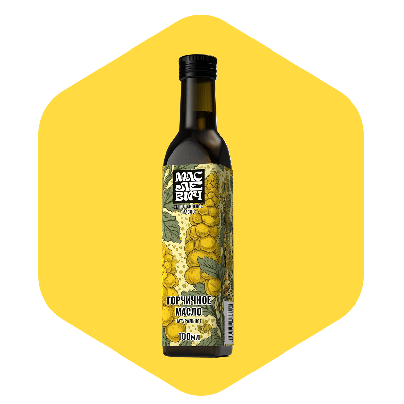 Горчичное масло холодного отжима в стеклянной бутылке 100/250 мл Натуральное горчичное масло первого холодного отжима производится из семян горчицы без термической обработки, что позволяет сохранить максимум пользы и насыщенный вкус. Это универсальный продукт как для кулинарии, так и для оздоровления.
